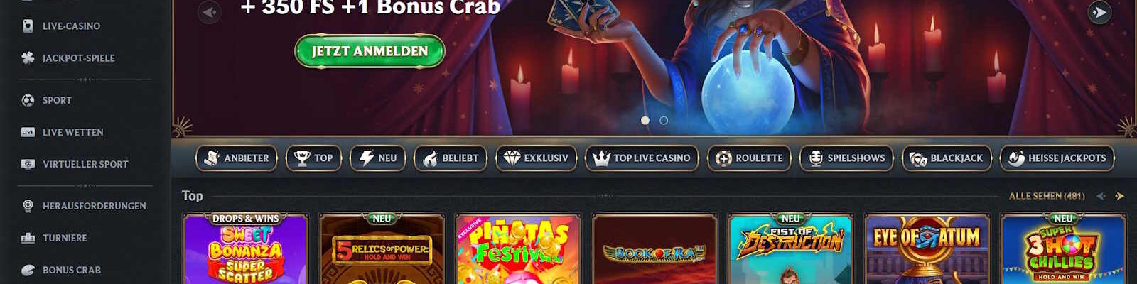 | Bonus | 250% Bonus bis 3000 € + 350 Freispiele + 1 Bonus Crab |